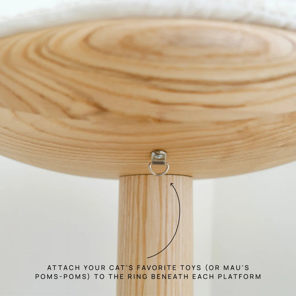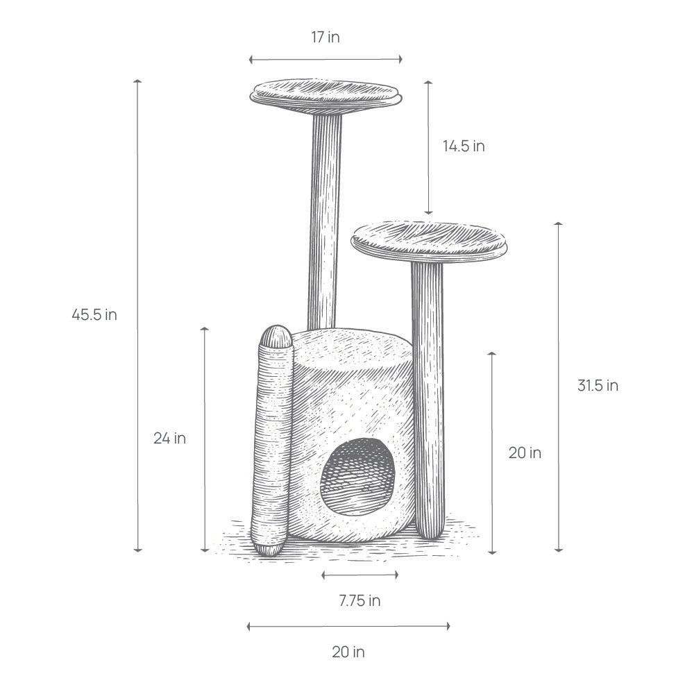 Introducing the Bao, a luxurious furniture piece that effortlessly combines modern elegance with functional design. Made with solid ash wood posts & platforms, this cat tree features two elevated perches and a plush cave for the ultimate feline retreat. Inspired by minimalist Japanese aesthetics, the neutral tones and sleek lines make it a perfect fit for any décor. All fabric components are removable and machine washable, allowing for easy cleaning and maintenance. The velcro-secured cushions provide your cat with a cozy and secure seat through the wildest zoomies. The Bao is not just a piece of furniture; it’s a statement of refined living for you and your beloved pet.
