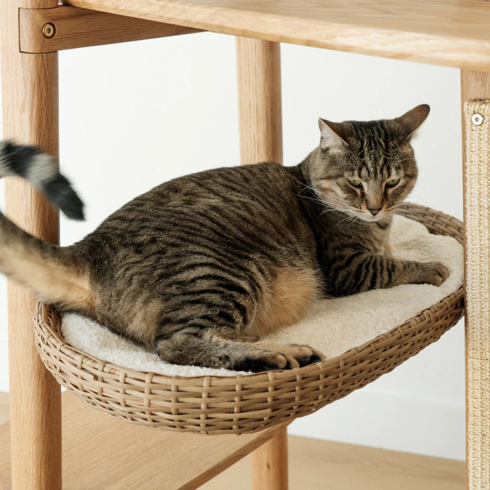 Designed with thoughtful precision, the Reiya offers a floating, staircase-like arrangement for your cat, promoting natural movement and engagement. Cozy, machine-washable cushions made from Oeko-Tex® performance fabric nestle comfortably within woven rattan baskets, while a cleverly angled replaceable scratching pad meets your cat’s scratching instincts with ease. With its vertically-oriented, space-conscious design, the minimalist Reiya maintains a light and open-air feel, making it well-suited even for smaller living spaces with single or multiple cats. A fusion of functional versatility and artistic appeal, the Reiya creates a luxurious experience for both cats and their owners.