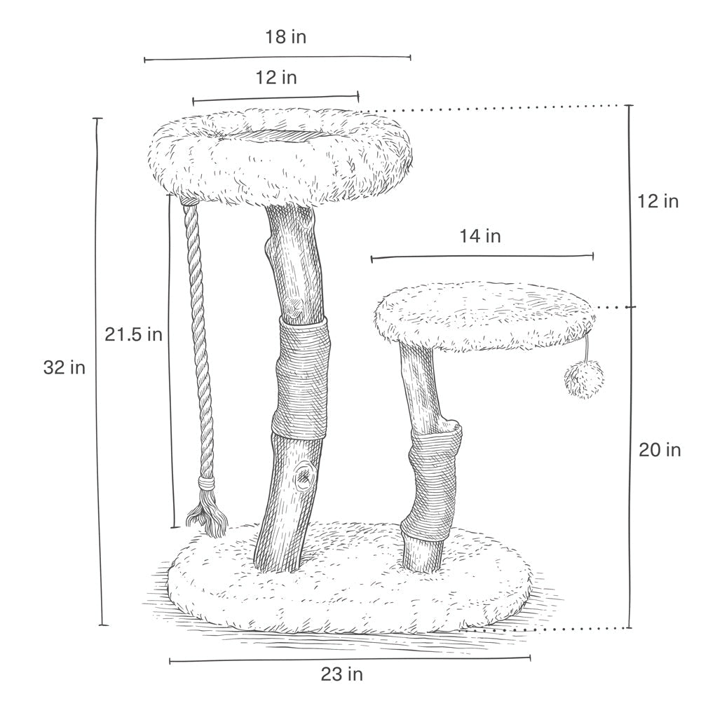 Naps are important but so is fun time, and there’s no reason a cat tree tower can’t provide both! Equally great for single or multi-cat households, the Rizzo comes with dual rest spots including a lower-level plush perch and a luxuriously fluffy cat bed just one foot higher on the upper level. Still, it’s the bells and whistles of this gem that make it a feline favorite. Made of real tree branches, properly treated for pet safety and long-term use indoors, this modern wood cat tree packs a playful punch with two sturdy scratching posts, a pom-pom toy, and a free-hanging 21.5-inch rope for irresistible fun. (By the way, don’t worry about using our valuable natural resources: We plant a new tree for every cat tree sold!)