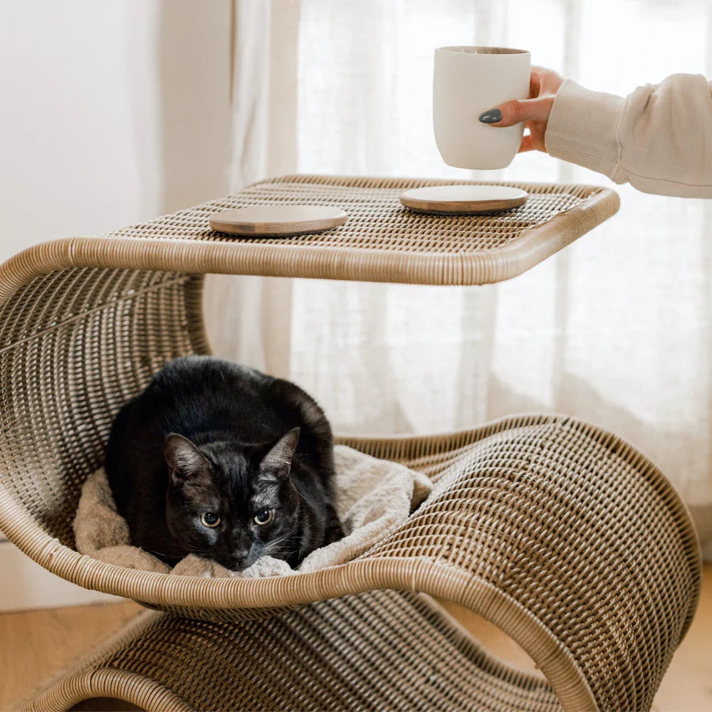 Introducing the Snake, a sculptural table designed for both you and your cat to enjoy. With its flowing design inspired by the organic movement and curvature of a snake, this multifunctional piece seamlessly brings natural elegance and feline comfort to your living space. The top tier serves as a tabletop surface for you (complete with two matching coasters) and beneath, a gently contoured middle section cradles a soft, machine-washable cushion, creating the perfect, hammock-like nesting spot for your cat to comfortably lounge. Finally, the bottom nook doubles as a playful tunnel and secure hideaway, ideal for cats who love to chase each other or tuck themselves away while remaining close to their humans.